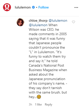 有网民还指出,这已经不是Lululemon第一次引发这种争议了,比如在2005年的时候,该品牌的创始人和前首席执行官Chip Wilson就曾嘲笑日本人念不出该公司的名称,他还说看着日本人努力尝试发音的样子“很好笑”。