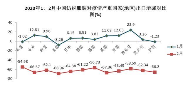 2月,我纺织服装共出口至198个国家(地区),对其中96%的国家(地区)下降。对重点出口市场欧盟、美国、东盟、日本分别下降62.1%、69%、55%和64.4%,降幅均超过一半。1~2月,对四大市场的降幅分别为14.5%、30.4%、17.6%和23.7%。
