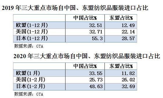 疫情初期,由于中国大力加强防控,复工复产率低,订单生产、出口受到影响。从主要市场进口数据中可以看出,中国产品的市场份额明显下滑:2月美国自中国进口占比下降迅速至22.8%,比2019年末下降了10个百分点,自东盟进口占比攀升至25.6%,首次超过中国;日本市场也表现出同样的趋势,1~2月自中国进口占比较去年末下降了6.7个百分点。同时,部分国外买家对中国信心不足,加快将订单向中国以外地区转移的速度,预计3、4月中国的市场份额仍会处于较低水平。但从后续的发展情况看,一方面中国政府采取强有力措施,有效控制住国内疫情,同时密集发布帮扶政策,帮助企业恢复生产,一季度末时全国90%以上的企业实现复工复产,中国的产能迅速恢复;一方面国外疫情加重并蔓延全球,与我产业形成竞争力的国家和地区均不能独善其身。加上欧美主要买方自顾不暇,大幅缩减交易量,订单转移的风险随之降低。