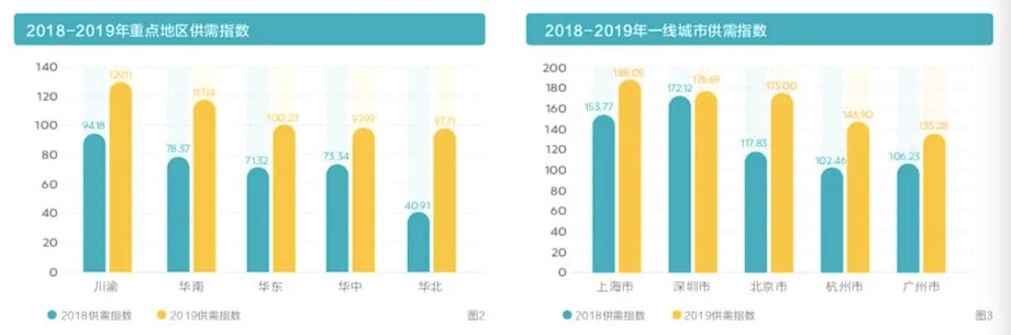 都市圈建设加剧人才争夺战,一线城市人才吸引力不分伯仲是其中一个招聘趋势。川渝经济圈整体招聘愈加活跃。华中继续保持与华东持平;而华北供指数由2018年的40.91上升到2019年的97.71,其借助北京疏散非首都功能的大背景向紧密集约型多组团格局转变,依然对人才有持续有力的吸引力。此外,新一线城市杭州供需指数上升到 146.90,超过广州成为第四。