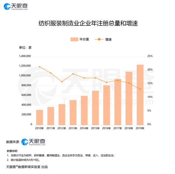 从企业注册的增速情况来看,2018年,全国新增纺织服装制造业企业达到顶峰,年新增超14万家,2019年则有所下滑。