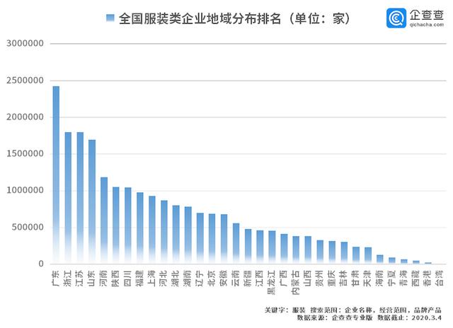 企查查数据显示,全国服装行业相关企业共有2248.94万家,其中广东省拥有的服装企业数量最多,约242.79万家,占全国服装企业总量的10.80%,浙江省和江苏省分别以17.98万家和17.97万家位于第二和第三名。