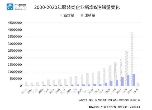 从2000年开始,服装类企业的新增量波动增长,2007年开始新增速度加快,当年新增量为52.42万家,2019年是新增速度最快的一年,同时也是新增量最大第一年,达381.72万家。与此同时,服装类企业的注销量也呈波动上升趋势,并于2019年达到了目前为止的注销量之最,约为86.98万家。