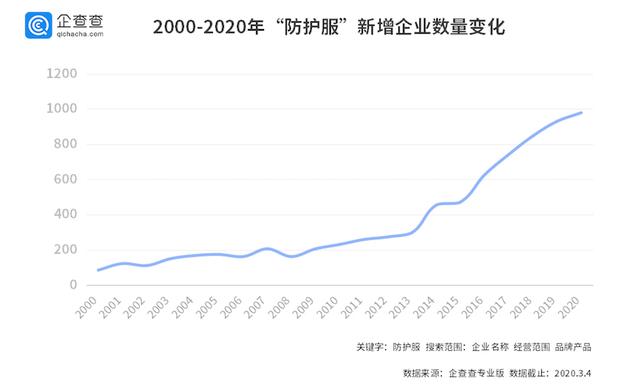 疫情之下,“防护服”相关企业如雨后春笋涌现。企查查数据显示,从2000年至今,“防护服”相关企业波动增长,2020年前三个月新增量已经达历年之最,新增979家,超过2019年一整年的增长量。