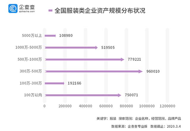 从全国服装类企业的资产规模来看,注册资本在100万元以内的企业数量最多,达75.01万家,资产规模在1000万-5000万以内的次之,企业数量为38.53万家。资产规模在300万-500万的企业数量最少,共有19.13万家。