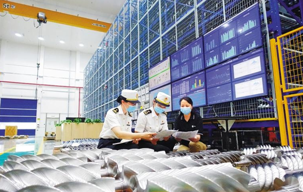 图为南京海关所属太仓海关关员辅导辖区内某空调企业建立符合“经认证的经营者”(AEO)标准关务系统,助力开拓RCEP制冷设备市场。杨泽浩摄