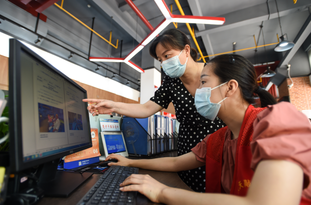 桂小妹(左)与社区工作人员交流工作。记者许魏巍 摄
