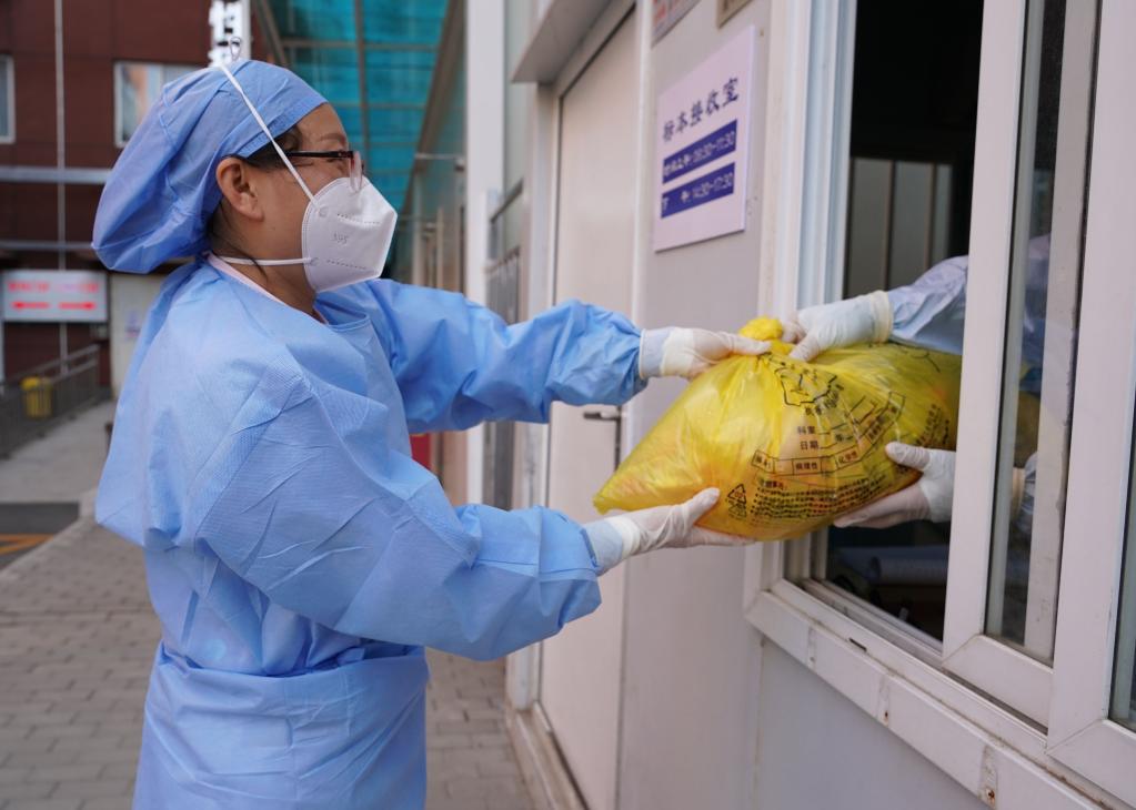 5月25日,在北京市上地医院,护师将取回的隔离酒店人员的核酸样本交给样本接收室医务人员。新华社记者任超摄