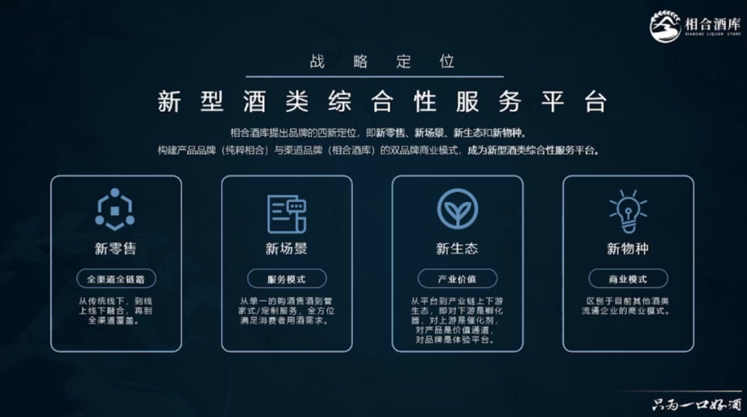 这个问题,也是杨乔山进入酒行业以后一直在思考的。入局之初,相合酒库就快速布局了线上线下的渠道,确定了战略方向,明确了四新定位,构建了双品牌商业模式。