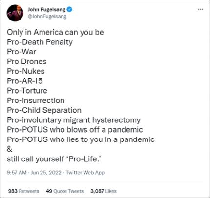 不过,支持堕胎权的自由派民众却发现,在保守派支持的其他政策里,就有提倡保留死刑、主张对外发动战争、拥护持枪等内容,这都和“尊重生命”看着非常不搭调。更重要的是,在美国疫情暴发后,这些人还曾经用“保护经济”替美国疫情扩散、防控不力导致大量民众感染后死亡来“洗地”,这无疑是对“尊重生命”最直接的讽刺。