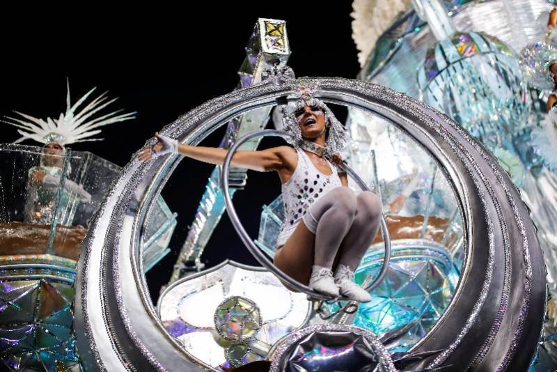 4月23日凌晨,在巴西里约热内卢的桑巴大道,桑巴舞校演员参加狂欢节游行表演。新华社