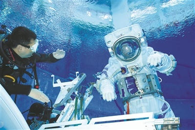 这是该中心模拟出舱训练的主要场地。航天员教员赵阳与航天员一起开展水下训练,已很长时间。一旦忙起来,赵阳一天只睡4个小时、吃一顿饭。教员的任务是分解每个动作,细化每个姿态,帮助航天员迅速、安全地找到返回的路。