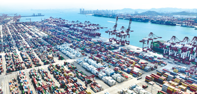 今年上半年,青岛港发往金砖国家的集装箱数量大幅增加。图为6月15日,集装箱货轮在青岛港前湾港区装卸集装箱。新华社记者 李紫恒摄