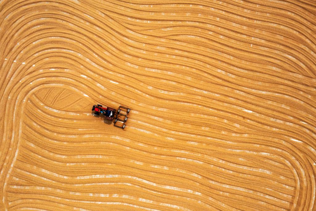 6月21日,山东省烟台市蓬莱区新港街道大皂许家村农民驾驶农机在场院里翻晒小麦。(无人机照片,新华社发 于良意 摄)