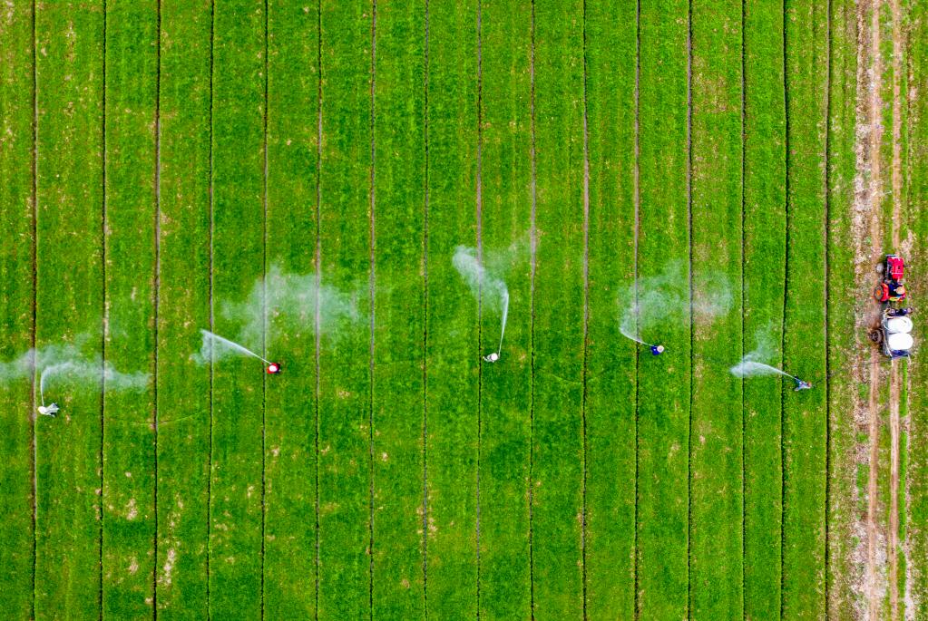 2月16日,安徽省庐江县白湖镇农民在进行小麦病虫害防治作业。(无人机照片,新华社发 左学长 摄)
