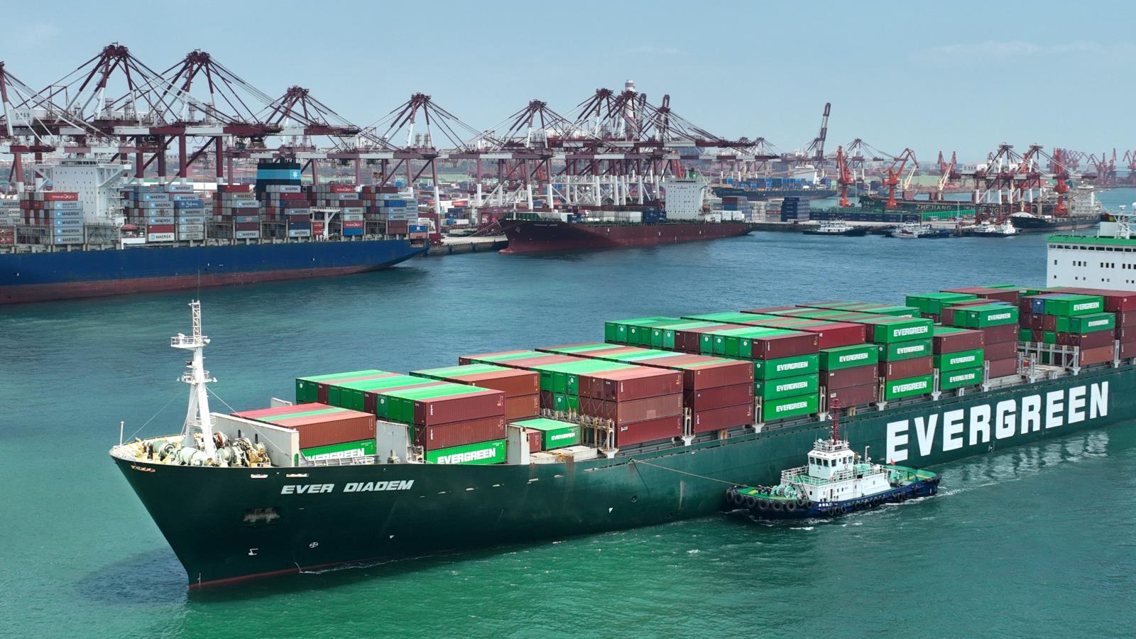 6月15日,山东港口青岛港前湾港区,一艘集装箱货轮正进港靠泊码头(无人机照片)。新华社记者 李紫恒 摄