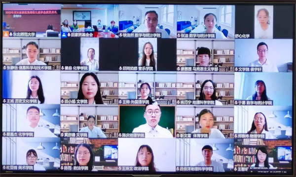 田家炳基金会主席田庆先先生在线上发表讲话,他代表基金会对本年度获奖学生顺利毕业并选择投身教育事业表示祝贺,对东北师范大学给予田家炳基金会发展的大力支持表示感谢。王延为获奖学生代表颁奖,并寄语全体获奖同学。王延详细阐述了田家炳基金会和东北师范大学的深厚情谊,讲述了疫情背景下学校评审奖学金的具体过程。同时对田家炳基金会成立40周年表示诚挚的祝福,对获奖学生提出殷切嘱托,他希望同学们心怀感恩,牢记“提升中国教育素质,贡献国家”,体悟田家炳先生创业艰辛,领会设奖初衷,传承教育使命。政法学院方宁代表获奖学生领奖并做了表态发言,他表示感谢学校的辛勤培养,感谢田家炳基金会的鼓励支持,未来会定会牢记母校嘱托,深深扎根基础教育一线,为国家的教育事业贡献自己的青春力量。