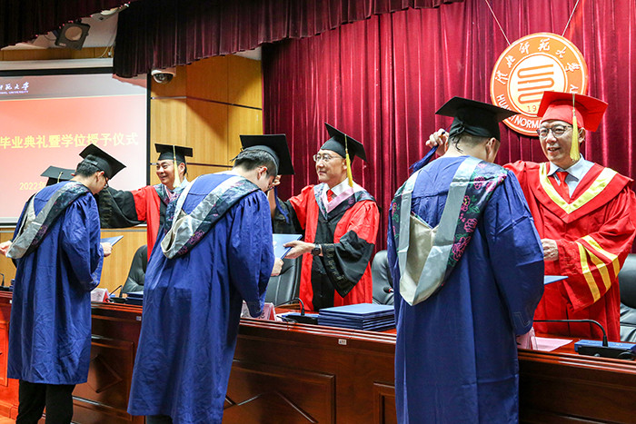 典礼上,校领导为每位获得学位的毕业生正冠拨苏,并颁发学位证书。
