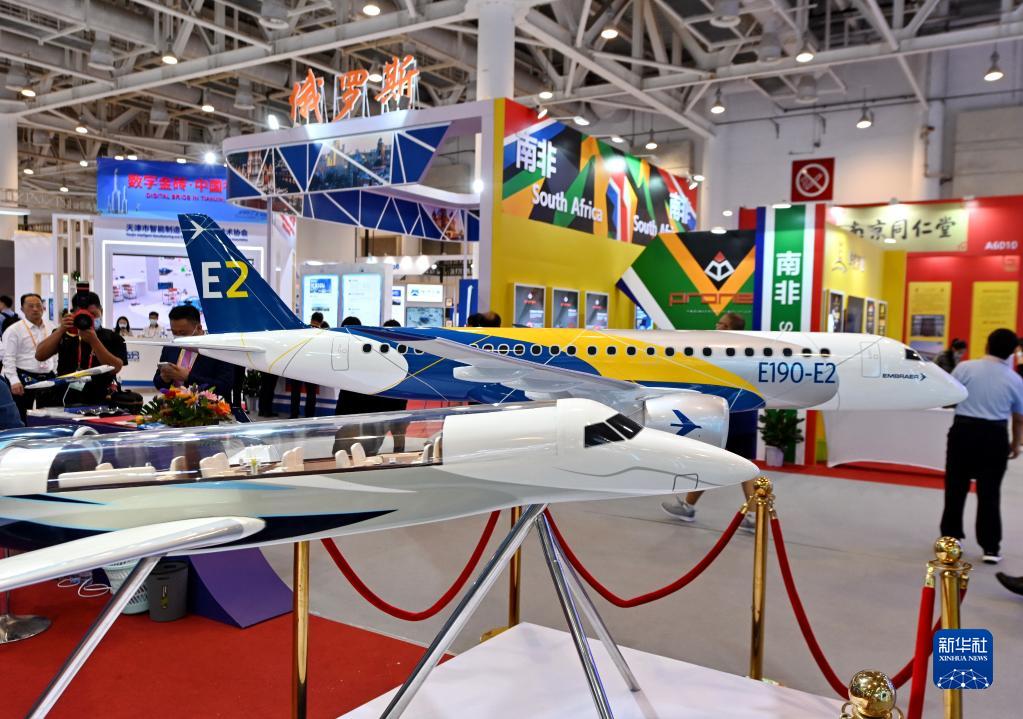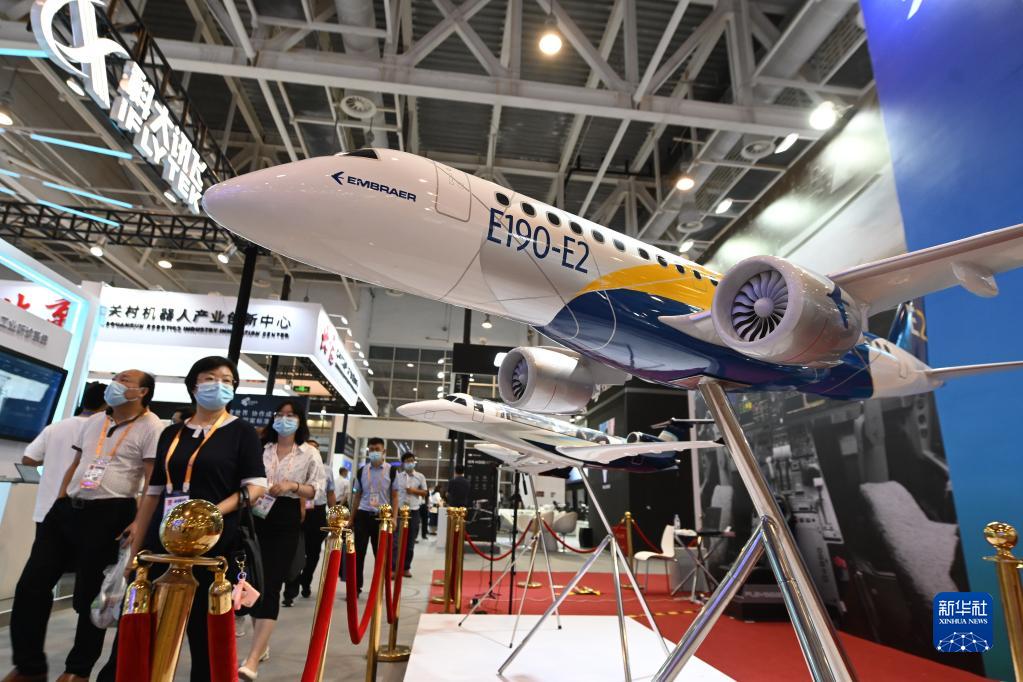 参观者从2021金砖国家新工业革命展展出的飞机模型前走过(2021年9月8日摄)。新华社记者 林善传 摄