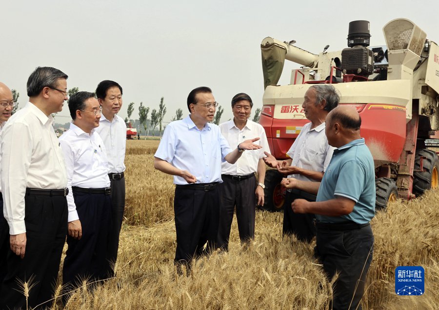 在方官镇小麦地里,李克强与种粮农户、外省来的收割机手、粮商们交谈。大家反映今年小麦收成好、颗粒饱满,李克强十分高兴。他说,现在是“丰收在田”,要抓紧收割“丰收在手”,还要做好收储“丰收入库”。小麦是中国人的主要口粮之一,现在站的这个地方基本上是黄淮海小麦主产区收割的最后一站,总体看今年全国小麦比去年增产,丰收已成定局。这给人们吃了定心丸,为全年粮食稳产打下了基础,中国粮食供应是充裕的,对稳物价至关重要。保持经济运行在合理区间,两个重要指标是稳就业稳物价,粮食和能源是稳物价的基本支撑。近年来我们一直实施稳健的货币政策,没有超发货币,目前货币政策主要指标在正常区间,很重要的也是为了防通胀,为应对新挑战灵活实施货币政策留下空间。今年小麦丰收保障了中国自身需求、中国粮食市场稳定,一定意义上也是对全球粮食市场稳定作贡献。看到农户在机播玉米,李克强仔细察看墒情。他说,夏迟一日、秋晚十天,要落实夏播面积,应播尽播,确保秋粮丰收,为国家粮食安全添秤加码。