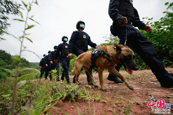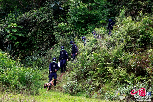 (云南普洱边境管理支队民警携警犬开展边境巡逻)