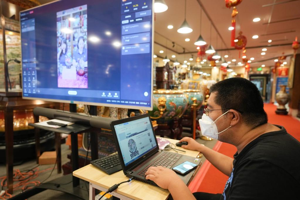 6月18日,在北京市珐琅厂有限责任公司,工作人员在网络直播间后台上架景泰蓝商品。(新华社记者鞠焕宗摄)