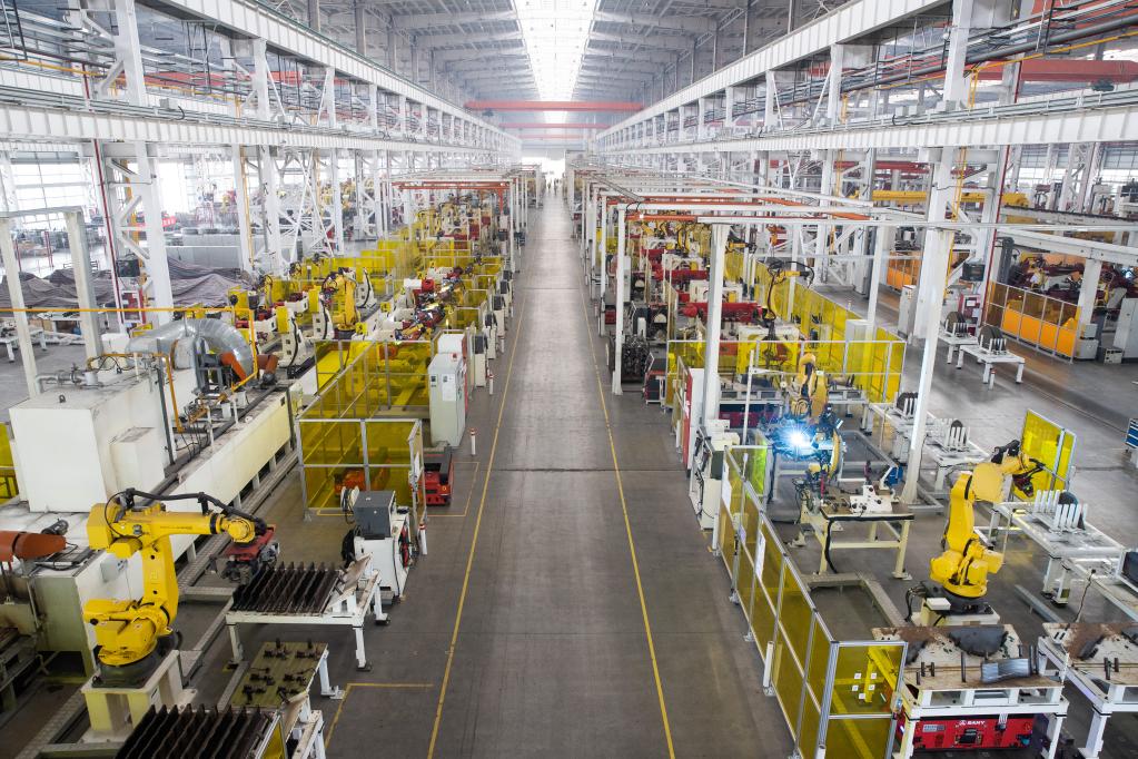 6月14日,在上海三一重机股份有限公司生产车间里,机器人正在作业。 新华社记者金立旺 摄