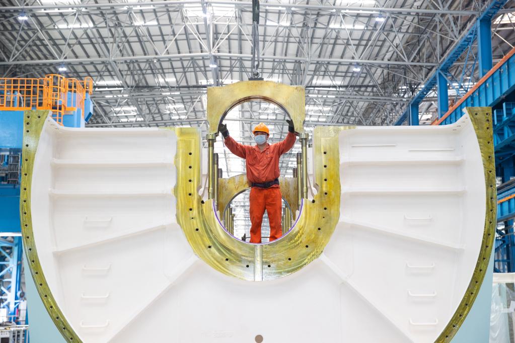 6月14日,在上海中船三井造船柴油机有限公司生产车间里,工作人员正在工作。 新华社记者金立旺 摄