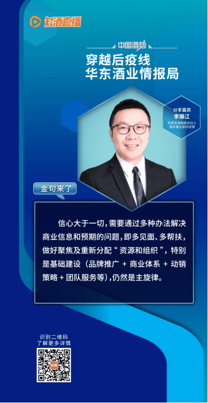 李振江则针对主做华东区域的厂家和身处其中的经销商,给出了系统的应对策略。他表示,疫情间断性暴发,进一步加速了品牌的集中化。强者恒强,当下,经销商对一二线白酒更为信任。在这个过程中,对抗外部环境的不确定性和被其他品牌市场侵蚀的核心关键动作是聚焦及重新分配“资源和组织”。李振江强调,无论是名优品牌还是新进品牌,渠道都不能单一化,必须立体多元,依靠聚焦性组织提高抗风险能力。否则,就无法享受到疫情稳定后新增的红利。疫情过后的市场基础建设,如品牌推广、商业体系、动销策略、团队服务等仍然是主旋律。李振江认为,品牌的基础建设决定了抗击风险与上层建筑的高度。李振江也详细强调了渠道的重要性,持续的渠道深耕与组织化落地是对抗风险的必要途径。疫情过后要深化厂商见面的沟通频率;同步给予客户新预期并叠加品宣招商活动的声势,提振商业端选择本品的信心。通过新支持、新预期的出现,来解决预期和市场端信心的问题。