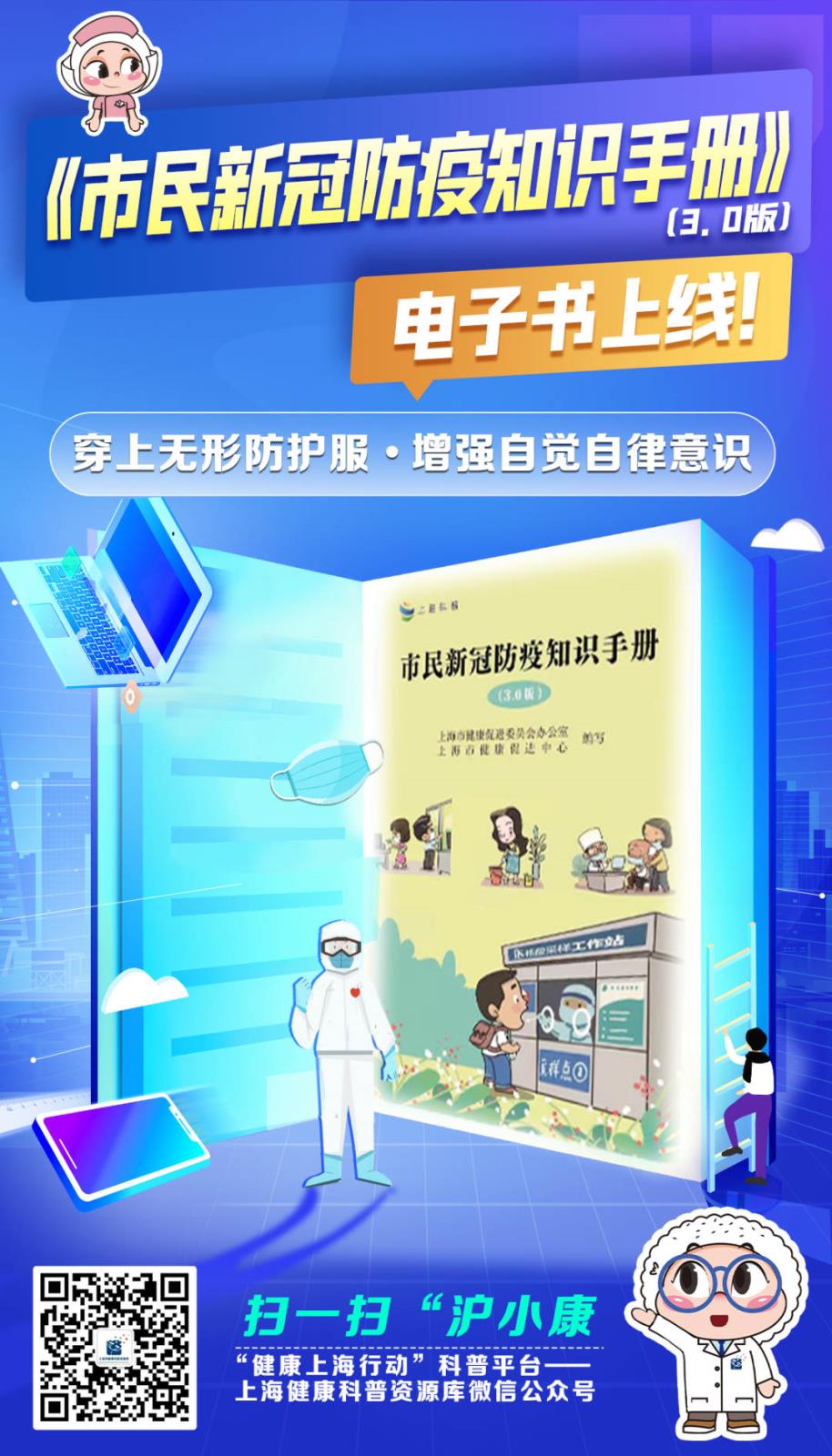 《市民新冠防疫知识手册》(3.0版)得到上海市科委专项支持,由上海市健康促进委员会办公室、市健康促进中心团队推出。