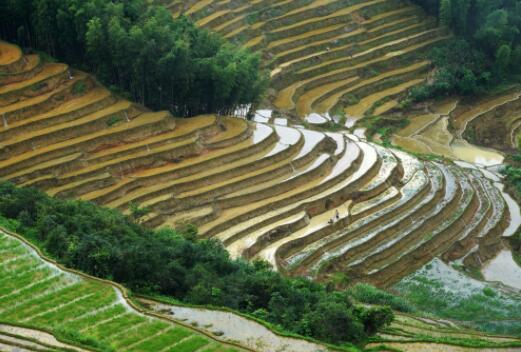 6月16日,农民在上堡梯田耕种。近日,江西省崇义县上堡乡的上堡梯田进入耕种时节,高山与水面衬托下的田埂宛如一曲曲大地的旋律,美不胜收。新华社记者万象摄
