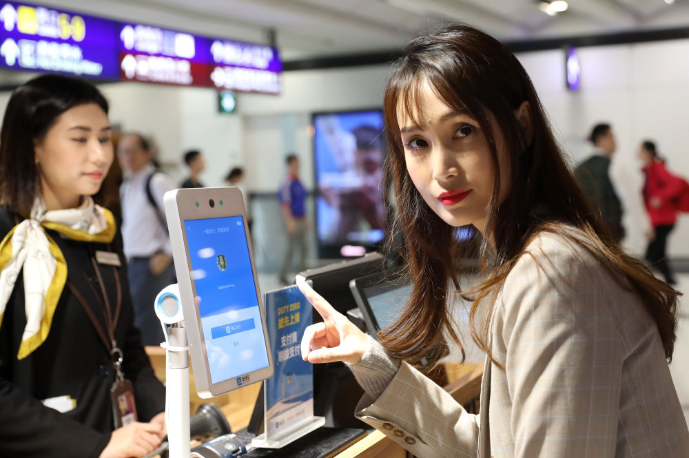 2019年4月1日,一名女士(右)在香港国际机场试验支付宝“刷脸支付”。新华社记者 吴晓初 摄