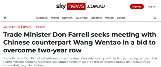 不过,新任澳洲政府又在近段时间释放出了积极的信号,除了双方国防部长一对一会谈,包括新任贸易部长也公开喊话,希望能和中国商务部长对话,明确表示:“中国是我们最大的贸易伙伴,双方都从我们的经济关系中受益。”