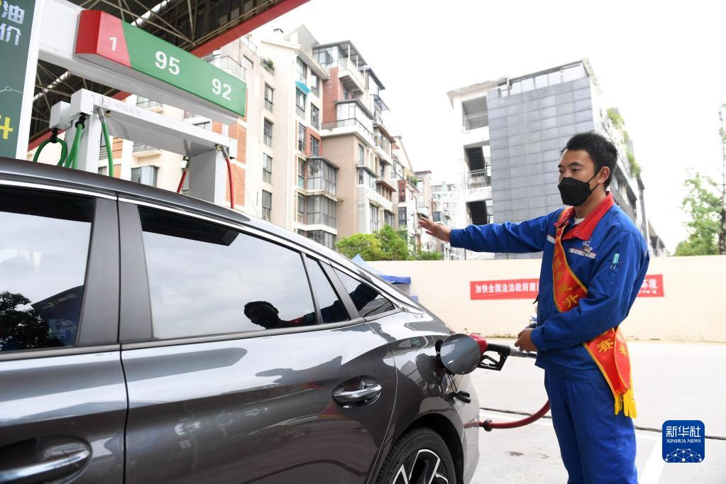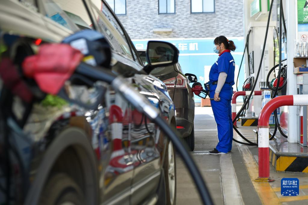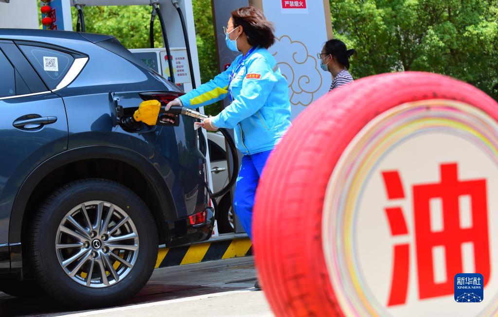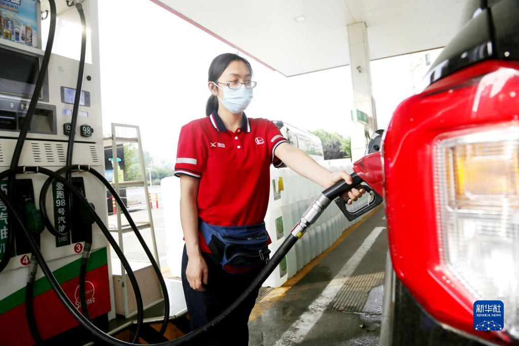 6月14日,在江苏省连云港市一加油站,工作人员给车辆加油。新华社发(王春摄)