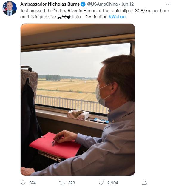 列车行至河南境内,伯恩斯在社交媒体发出了一张自己坐在列车窗边的照片,并表示:“刚刚,我乘坐令人赞叹的复兴号列车,以每小时308千米的高速经过了黄河。”
