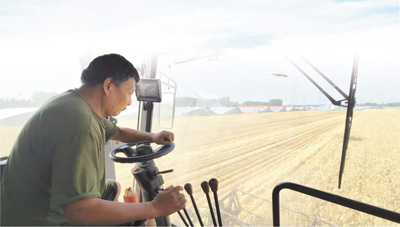 6月11日下午,李广利在山东省阳谷县西湖镇驾驶收割机作业。本报记者 王 者摄