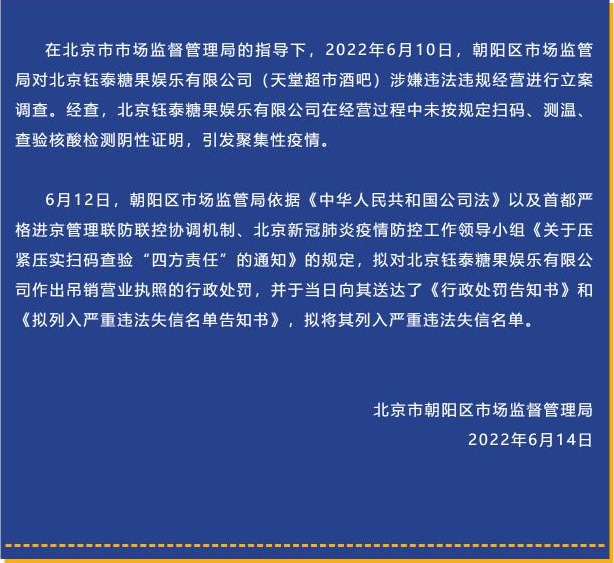 记者从北京市朝阳区市场监督管理局获悉,6月12日,朝阳区市场监督管理局依据《中华人民共和国公司法》以及首都严格进京管理联防联控协调机制、北京新冠肺炎疫情防控工作领导小组《关于压紧压实扫码查验“四方责任”的通知》的规定,拟对北京钰泰糖果娱乐有限公司(天堂超市酒吧)作出吊销营业执照的行政处罚,并于当日向其送达了《行政处罚告知书》和《拟列入严重违法失信名单告知书》,拟将其列入严重违法失信名单。