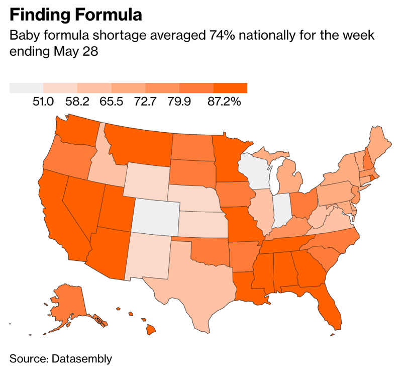 在美国,6个月以上婴儿中有75%以吃奶粉为主。数据显示,全美婴儿配方奶粉平均缺货率一度上升至74%,其中14个州的缺货率达到90%甚至更高。5月22日,美国纽约市市长宣布,该市因婴儿配方奶粉供应短缺进入紧急状态。