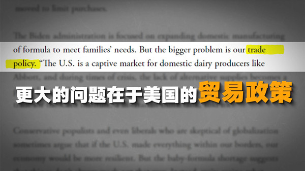 为保护国内生产商免受外国产品的竞争冲击,美国严格控制配方奶粉进口,高筑关税壁垒。在疫情等外部因素的冲击下,美国大搞贸易保护主义等累积已久的问题终于以一场奶粉危机的形式暴露出来……