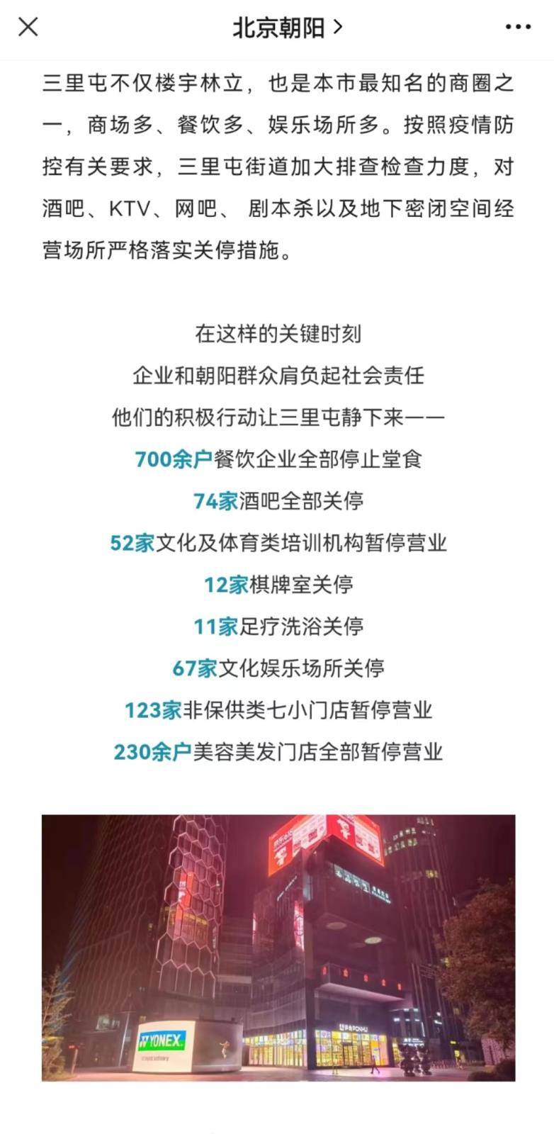 中国网6月14日讯(记者 谢露莹)据北京市朝阳区官方微信公众号“北京朝阳”今日消息,为尽快阻断病毒传播链条,三里屯700余户餐饮企业全部停止堂食,74家酒吧全部关停,52家文化及体育类培训机构暂停营业,12家棋牌室关停,11家足疗洗浴关停,67家文化娱乐场所关停,123家非保供类七小门店暂停营业,230余户美容美发门店全部暂停营业。