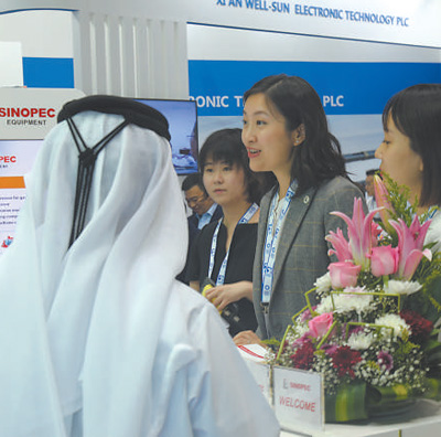 在阿联酋阿布扎比国际石油展上,中方工作人员向外国客商介绍易派客平台。
