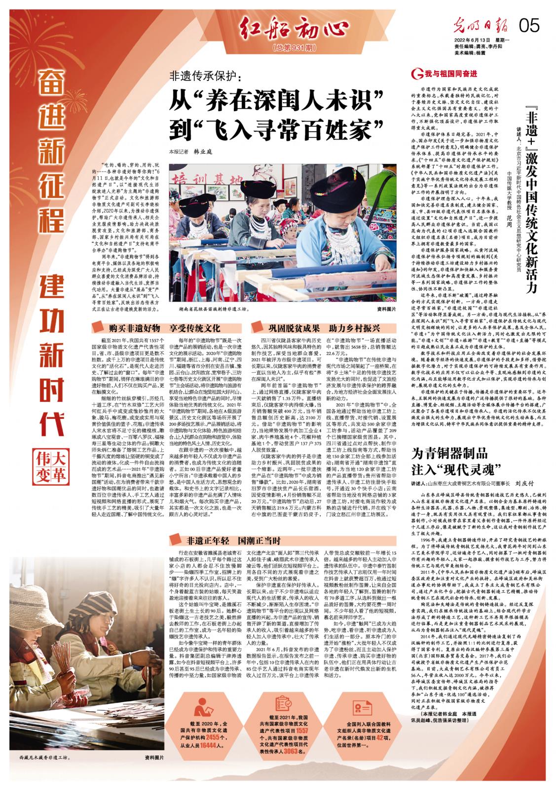 截至2021年,我国共有1557个国家级非物质文化遗产代表性项目,省、市、县级非遗项目更是数不胜数。成千上万的非遗项目是传统文化的“活化石”,是现代人走进历史、了解过去的“窗口”。每年“非遗购物节”期间,徜徉在琳琅满目的非遗好物前,人们不仅在购买产品,更在触摸文化。