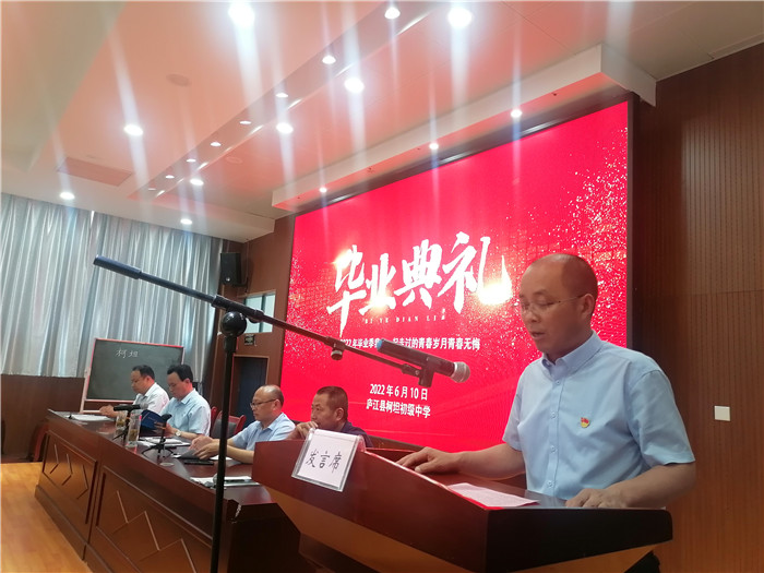 最后,校长马国亮致辞。马校长首先祝贺顺利完成初中学业的2022届的同学们在柯中收获了知识、友谊、关爱,希望同学们一要不忘学习、二要懂得感恩、三要讲究诚信、四要勇于进取,最后祝同学们金榜题名,学业有成,向母校、老师、家长和自己交上一份满意的答卷。