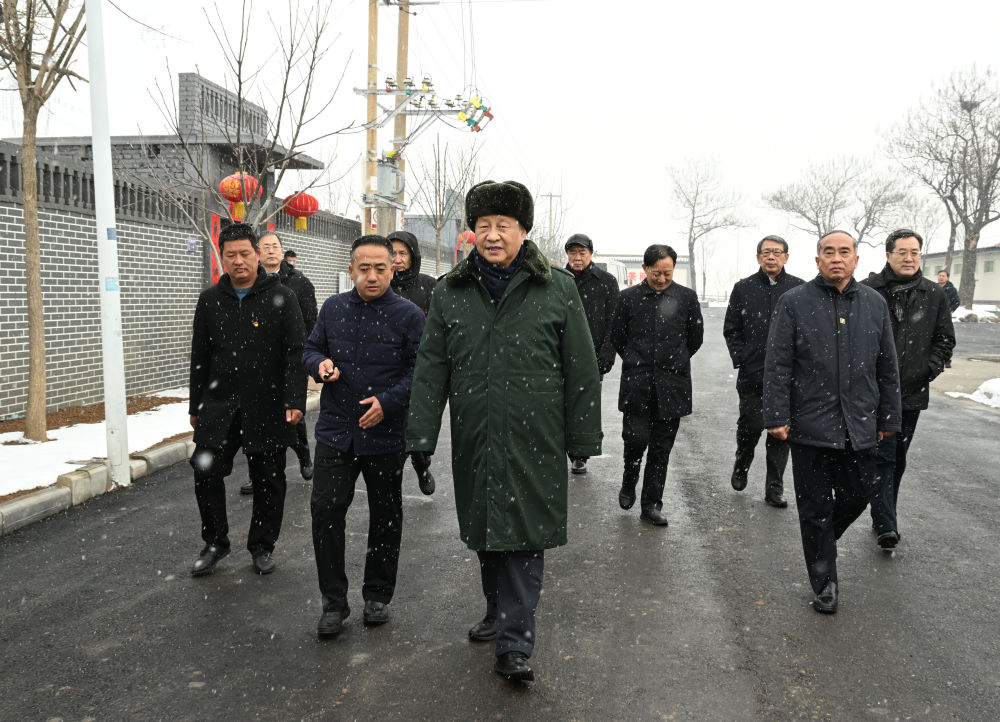 ↑2022年1月26日下午,习近平冒雪在山西省临汾市霍州市师庄乡冯南垣村考察。