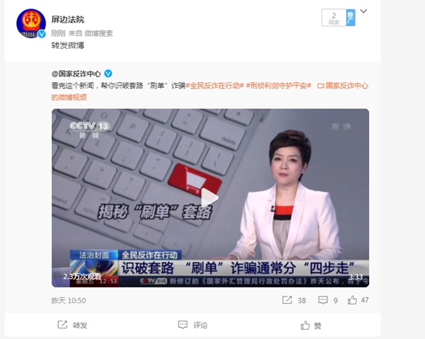 利用本院官方微博、微信公众号、官方网站等自媒体,转发防诈反诈宣传链接、反诈宣传短视频、典型案例、图片等内容,号召干警积极通过微信朋友圈转发各类反诈宣传链接,扩大宣传影响力。截至目前,共通过官方微博转发反诈链接20余篇,微信公众号开展转发反诈知识、典型案例13篇次,官方网站转发反诈知识5篇次,此外干警并自行转发各类反诈宣传知识200余条。
