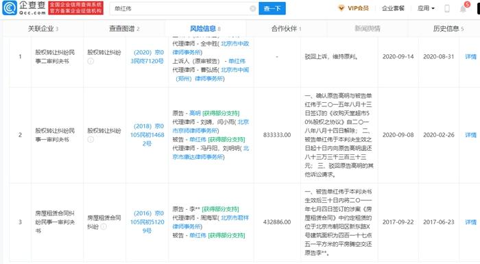 还有一个是高明与单红伟股权转让纠纷的案件,从2015年开始,这场官司打了5年之久,最后这起案件一审被告单红伟向原告高明退还833333元。后续双方均提起上诉,2020年2月26日,法院二审维持原判。