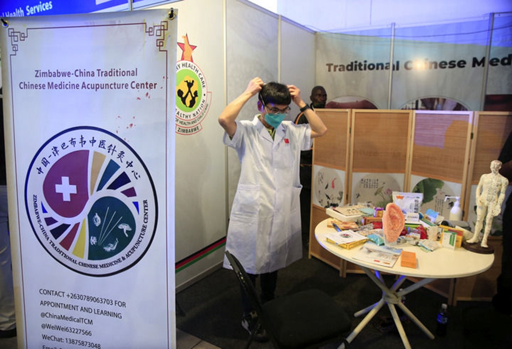 4月29日,中国-津巴布韦中医针灸中心负责人、中国援津医疗队队长朱伟在津巴布韦布拉瓦约的津巴布韦国际贸易博览会中医药展台工作。新华社发(肖恩·朱萨摄)
