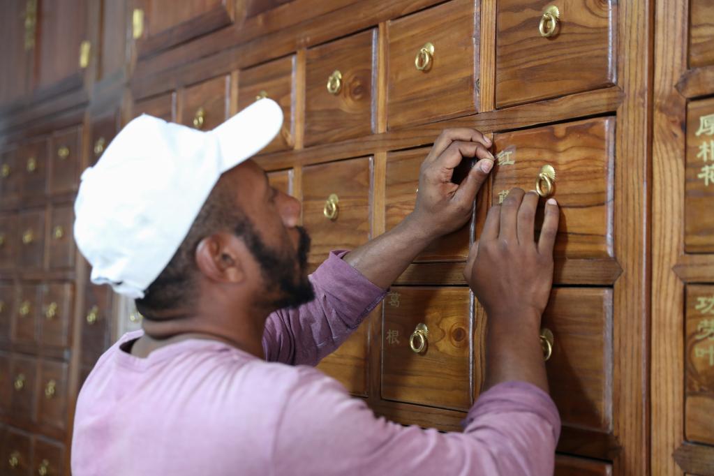2018年11月10日,在巴布亚新几内亚莫尔兹比港中国(广东)-巴新疟疾防治中心,一位工作人员为防治中心的中药房药箱安装中文说明。新华社记者白雪飞摄