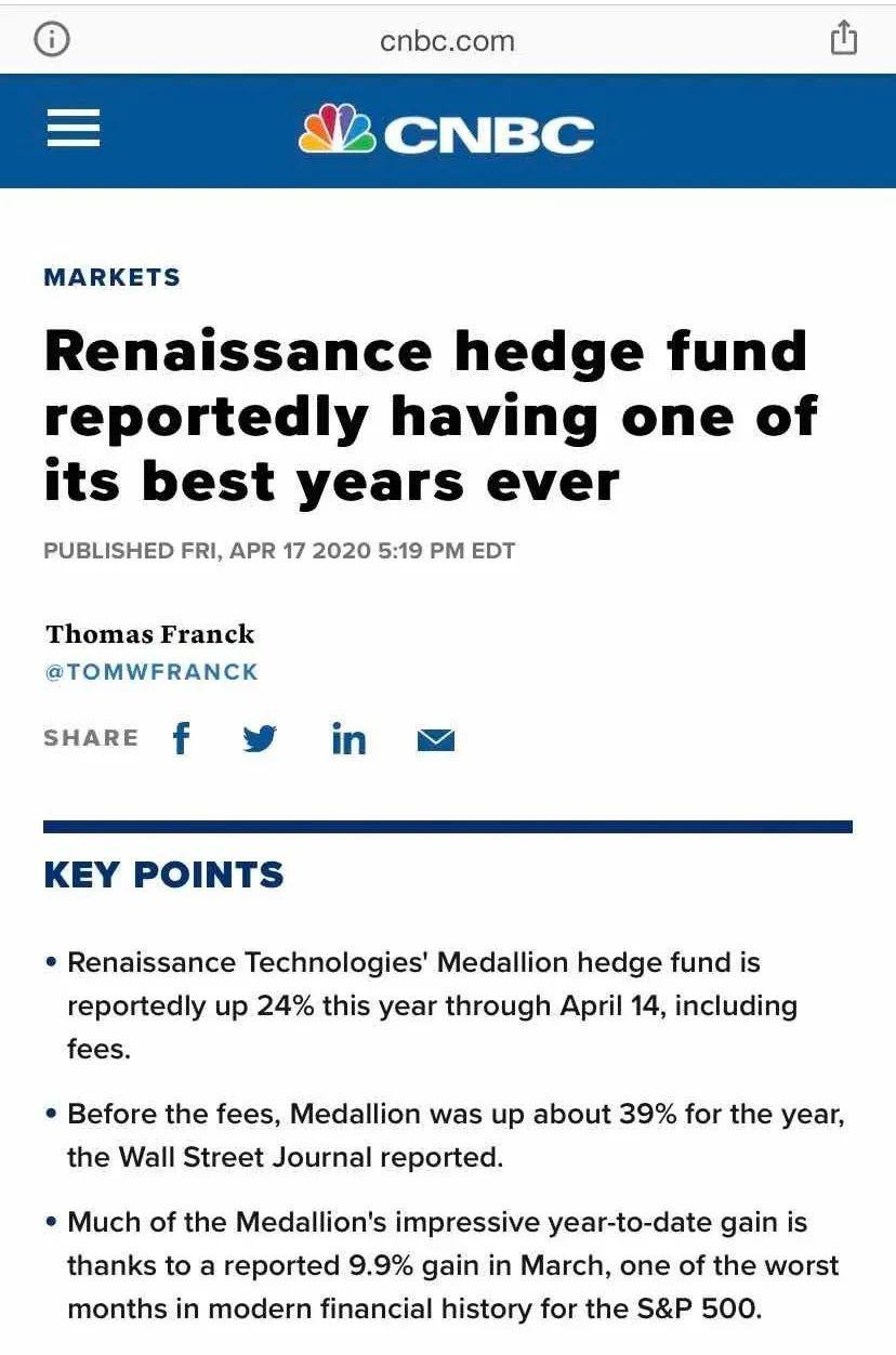 但总有人能抓住其他人抓不住的机会,据华尔街日报,截至 4 月 14 日,文艺复兴科技公司(Renaissance Technologies)旗下的大奖章基金今年累计收益率达 39%。扣除佣金之后,大奖章基金依然拥有 24% 的收益率。