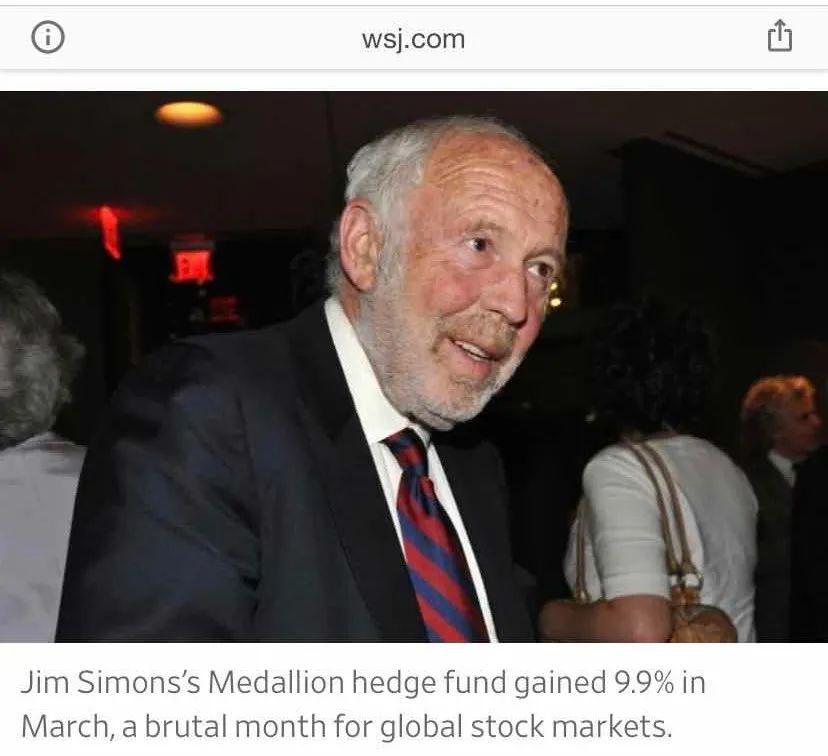 除了阿克曼之外,华尔街还有一位著名投资人,詹姆士 · 西蒙斯(Jim Simons ),截至今年 4 月 14 日,他创立的文艺复兴科技旗下 " 大奖章基金 "(Medallion)获得了 24% 的收益。在市场恐慌情绪蔓延的 3 月,大奖章基金获得了 9.9% 的回报。